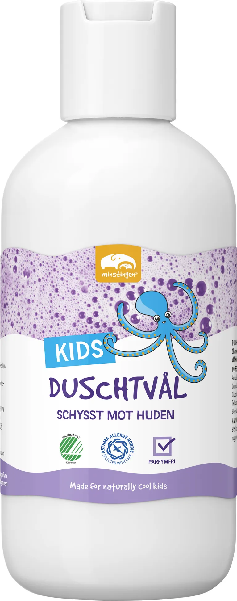 Parfymfri duschtvål för barn. Schysst mot huden. Svanenmärkt och godkänd av Asthma Allergy Nordic.