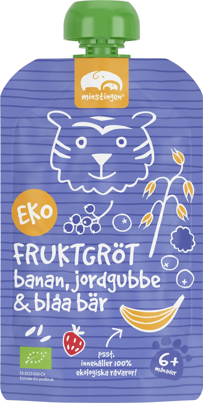 Fruktgröt i klämpåse med smak av banan, jordgubbe och blåa bär. Innehåller 100% ekologiska råvaror. Perfekt mellis när din vilding behöver energi. Förvaras i rumstemperatur. Öppnad förpackning förvaras i kylskåp +8°C, håller i högst ett dygn.