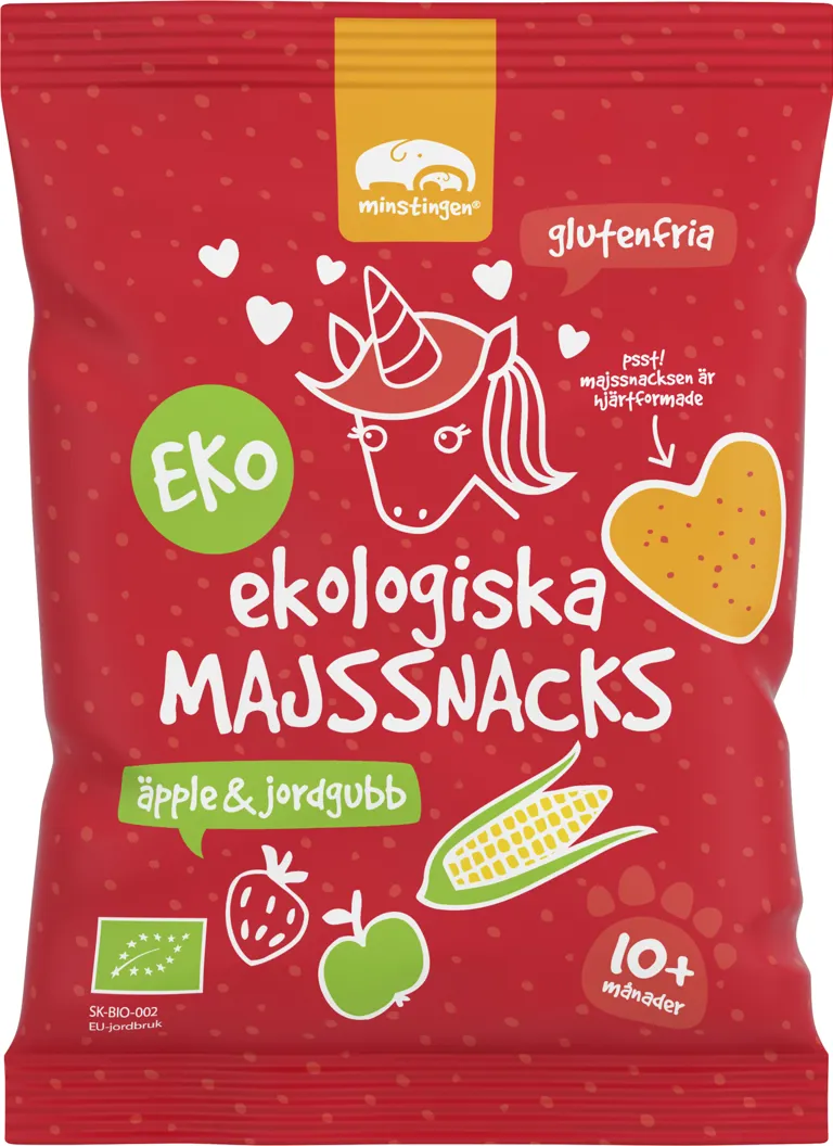 Hjärtformade glutenfria ekologiska majssnacks med smak av äpple och jordgubb. Perfekt mellis när din vilding behöver energi. Förvaras i rumstemperatur.