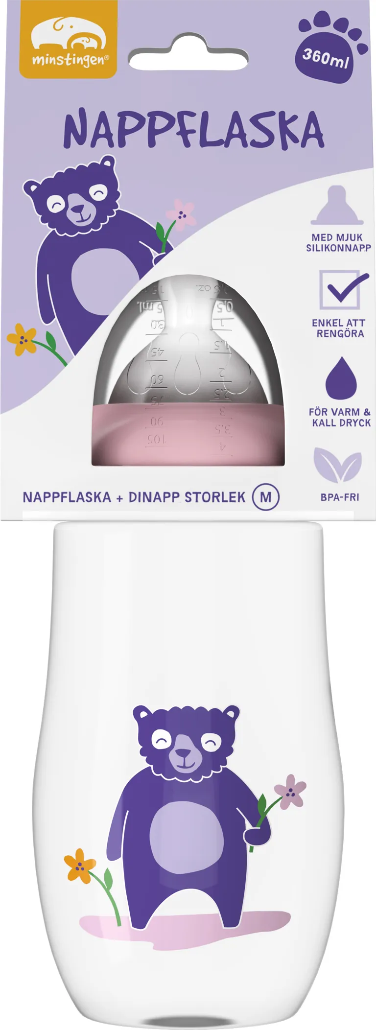 Nappflaska 360ml med tillhörande dinapp av mjuk silikon. Flaskan håller för både varm och kall dryck och är enkel att rengöra. När vätskan ska värmas i flaskan måste det ske utan förskruvning och dinapp. Flaskan kan användas i mikrovågsugn. Material: BPA-fri nappflaska och dinapp. Nappflaska av polypropen (PP) och dinapp i mjuk silikon.